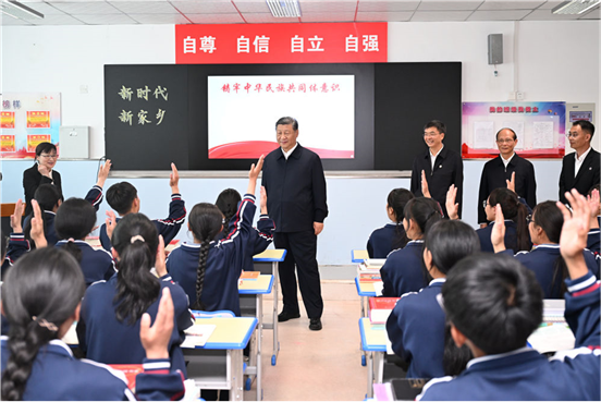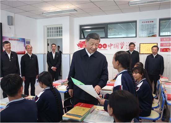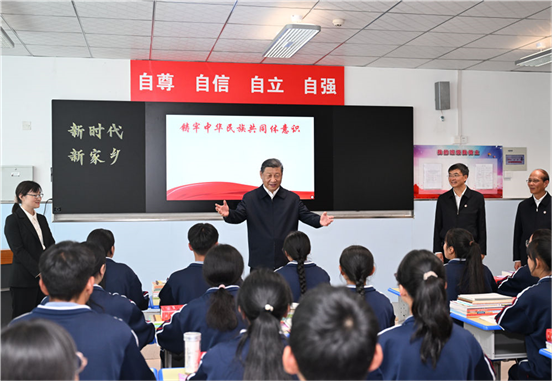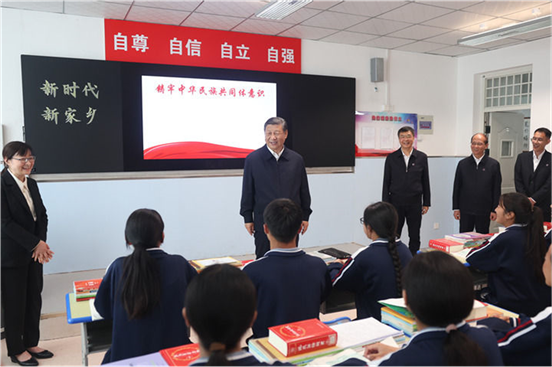 18日下午,习近平首先来到果洛西宁民族中学考察。这是一所隶属于果洛藏族自治州的寄宿制中学,由上海市投资援建。习近平听取上海等东部地区援助青海教育工作和学校建设情况介绍,详细询问学生构成、课程设置、体育锻炼、普通话水平等情况,走进食堂、宿舍楼察看学生就餐和住宿条件,嘱咐食堂工作人员一定要确保学生饮食安全、营养可口。之后,他来到高一(1)班教室,观摩“新时代、新家乡”主题思政课。了解到学校将思政课内容融入日常教学,听了孩子们讲述新时代家乡的可喜变化,看了孩子们的画作,习近平十分高兴。他说,包括教育在内的东西部协作和对口支援取得显著成效,充分彰显了中国共产党领导和中国特色社会主义制度的优势,充分体现了中华民族大家庭的温暖。要把铸牢中华民族共同体意识作为学校思政课的一个重点,讲好中国共产党和中国特色社会主义的故事,讲好新时代以中国式现代化全面推进强国建设、民族复兴伟业的故事,讲好中华民族共同体和民族团结进步的故事,把中华民族共同体意识从小就植入孩子们的心灵。