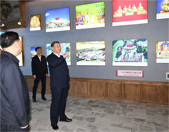 随后,习近平来到位于西宁市城中区的宏觉寺。在寺前院落,宏觉寺民主管理委员会负责人向总书记敬献哈达,僧人提香炉、持宝伞迎接总书记。习近平参观青海省民族团结进步教育基地展陈等,了解寺庙历史沿革、老一辈革命家关心推动民族工作和宗教工作的情况。他走进大殿,听取寺庙加强日常管理、促进民族团结进步等情况介绍。习近平指出,宏觉寺这座千年古刹,在增进历代中央政府与藏传佛教联系方面发挥了重要的桥梁纽带作用。要保护好这份珍贵的历史文化遗产,为铸牢中华民族共同体意识、促进民族团结进步作出新贡献。要向老一辈革命家学习,把新时代党的统战工作、民族工作、宗教工作做得更好。习近平强调,以中国式现代化全面推进强国建设、民族复兴伟业,需要全国各族人民包括广大信教群众团结奋斗。希望青海藏传佛教界弘扬爱国爱教优良传统,促进宗教和顺、社会和谐、民族和睦,在中国式现代化进程中发挥积极作用。